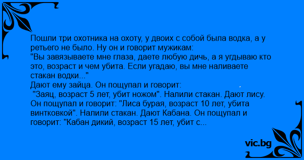 "Заяц, возраст 5 лет, убит ножом". Налили стакан. Дают лису. Он пощупал и говорит: "Лиса бурая, возраст 10 лет, убита винтковкой". Налили стакан. Дают Кабана. Он пощупал и говорит: "Кабан дикий, возраст 15 лет, убит с ружья!".