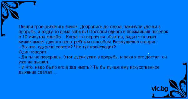 Пошли трое рыбачить зимой. Добрались до озера, закинули удочки в прорубь, а водку-то дома забыли! Послали одного в ближайший посёлок в 10 минутах ходьбы... Когда тот вернулся обратно, видит что один мужик имеет другого непотребным способом. Возмущенно говорит: