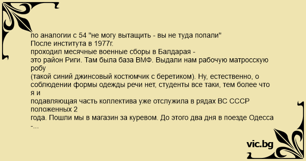 по аналогии c 54 "не могу вытащить - вы не туда попали" После института в 1977г. проходил месячные военные сборы в Балдарая - это район Риги. Там была база ВМФ. Выдали нам рабочую матросскую робу (такой синий джинсовый костюмчик с беретиком). Ну, естественно, о соблюдении формы одежды речи нет, студенты все таки, тем более что я и подавляющая часть коллектива уже отслужила в рядах ВС СССР положенных 2 года. Пошли мы в магазин за куревом. До этого два дня в поезде Одесса - Рига с пересадкой в Киеве, в организмах только "Ркацители" и "Жигулевское" и соотвественный внешний вид. Когда шли то обратили внимание - никого на территории не видно. Ни матросиков, ни офицеров, ни мичманов. Как в "ДМБ" - "И птиц не слышно". Но реакция на это у всех нулевая. Назад идем, по дорожке едет зеркально черная "Волга", тормозит, из нее вылетает кап-раз гвардейского размера, подбегает к нам и ко мне (поскольку я шел первым) - "Ты откуда?!!!". Честно отвечаю - "Я из магазина". У капраза моментальное кислородное голодание, ловит ртом воздух и повторно "Ты откуда?!!!". С нас ажно беретики сдувает. Я абсолютно офигевший повторяю "С магазина, товарищ капитан первого ранга". В машине откывается задняя дверь, высовывается контрадмирал, и так спокойненько "Палыч, остынь это студенты". Палыч конечно выдал инструкцию куда нам ходить, как ходить и т. д. , ну уже вяло. Оказывается в тот день наши индусам МРК (малый ракетный кораболь) передавали, и по этому поводу шишки и понаехали. Больше контрадмиралы мне живьем не попадались. А Палыча, как нам потом объяснили, интересовало с какого мы подразделения.