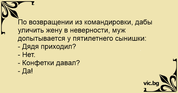 По возвращении из командировки, дабы уличить жену в неверности, муж допытывается у пятилетнего сынишки: