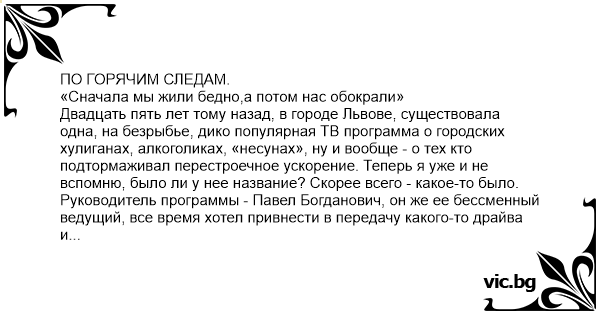 ПО ГОРЯЧИМ СЛЕДАМ. «Сначала мы жили бедно,а потом нас обокрали» Двадцать пять лет тому назад, в городе Львове, существовала одна, на безрыбье, дико популярная ТВ программа о городских хулиганах, алкоголиках, «несунах», ну и вообще - о тех кто подтормаживал перестроечное ускорение. Теперь я уже и не вспомню, было ли у нее название? Скорее всего - какое-то было. Руководитель программы - Павел Богданович, он же ее бессменный ведущий, все время хотел привнести в передачу какого-то драйва и серьезного криминала, ему до смерти надоели сюжеты об украденных с «Керамзавода» унитазах, о буднях вытрезвителя, или сорванных с городской клумбы тюльпанах: - "Мы находимся в седьмом отделении милиции, позади меня вы видите Ольгу Николаевну Трущак, контролера готовой продукции завода «Полярон». Гражданка Трущак, под покровом ночи сорвала более десяти тюльпанов у памятника Ивану Франко, за что и была задержана". Далее ведущий вешал мхатовскую паузу, изображал титаническую работу мозга, о судьбах страны и задумчиво выдавал умнейшую мысль: - «Я вот тут подумал, товарищи – а не потому ли Ольга Николаевна Трущак работает контролером на заводе, что не может контролировать свои собственные поступки?...» Короче, все это было довольно мелко и не спасали даже мудрые мысли звучащие в кадре. Павел Богданович мечтал о серьезных делах: жестоких разбоях, грабежах, ну, в крайнем случае - изнасилованиях, а главное, чтобы снимать программу не только в милиции или зале суда, а непосредственно в момент преступления, ну, на худой конец – сразу после. И вот однажды нам повезло - знакомый капитан милиции позвонил среди ночи Павлу Богдановичу и сказал: - Собирай своих орлов, тут у меня квартирная кража, если успеешь, то сможешь снять, как мы работаем на выезде. Это на улице Ленина, в районе танка. Шеф моментально всех обзвонил - это был его звездный час, еще бы, настоящая опергруппа на настоящей квартирной краже. Через час мы были уже на месте, разматывали кабели и устанавливали камеры (Ваш покорный слуга работал в той съемочной группе скромным «светлячком»). В конце концов, сюжет получился весьма боевой, правда, не такой лютый, как мечтал шеф, но все же гораздо живее, чем о каких-то вялых, подлосорванных тюльпанчиках: - «Мы находимся в самом центре событий, позади меня окна только что ограбленной квартиры. Вы слышите приближающийся вой сирены? Это подоспела опергруппа. Поспешим же за ними, и вы, дорогие друзья, сейчас своими глазами увидите их нелегкую работу по раскрытию этого страшного преступления». Затем пару правильных слов сказал капитан, а в конце сюжета, на закуску, мы показали воющего от бессильной злобы, самого потерпевшего - хозяина квартиры. Он терзал на голове жидкие волосенки и стонал: - «Эх, какой магнитофон, какой магнитофон, во я дуpak, всю жизнь мечтал о таком, во дуpak, какой магнитофон, никогда себе этого не прощу…!» (его слезы были самыми настоящими и наверняка произвели неизгладимое впечатление на нашего зрителя). …А теперь, я расскажу о том, что же осталось за кадром: Хозяин квартиры – тихий пятидесятилетний алкоголик, вернувшись из деревни, где провел отпуск, подошел к своему дому и заметил, что окно подозрительно приоткрыто. Мужик поднялся на носочки, заглянул в комнату – сомнения отпали, в квартире кто-то побывал. Не заходя внутрь, чтобы не затереть следов преступлен
