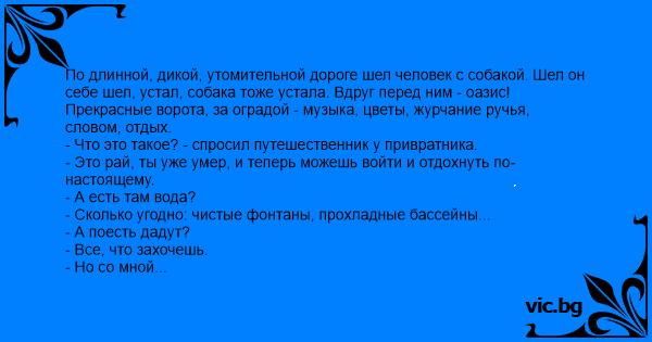 По длинной, дикой, утомительной дороге шел человек с собакой. Шел он себе шел, устал, собака тоже устала. Вдруг перед ним - оазис! Прекрасные ворота, за оградой - музыка, цветы, журчание ручья, словом, отдых.