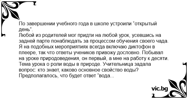 Любой из родителей мог придти на любой урок, усевшись на задней парте понаблюдать за процессом обучения своего чада. Я на подобных мероприятиях всегда включаю диктофон в плеере, так что ответы учеников привожу дословно. Побывал на уроке природоведения, он первый, а мне на работу к десяти. Тема урока о роли воды в природе. Учительница задала вопрос: кто знает, каково основное свойство воды? Предполагалось, что будет ответ “вода жидкая”. Пол-класса подняли руки, учительница стала спрашивать по очереди.