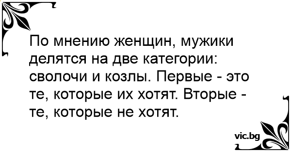 По мнению женщин, мужики делятся на две категории: сволочи и козлы. Первые - это те, которые их хотят. Вторые - те, которые не хотят.