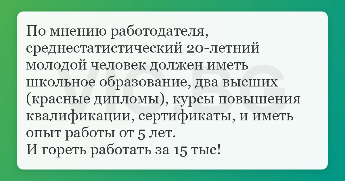 По мнению работодателя, среднестатистический 20-летний молодой человек должен иметь школьное образование, два высших (красные дипломы), курсы повышения квалификации, сертификаты, и иметь опыт работы от 5 лет. И гореть работать за 15 тыс!