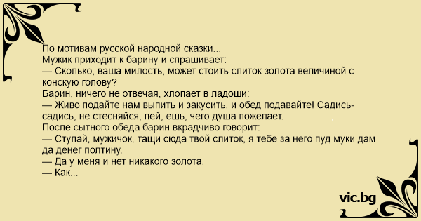 — Ступай, мужичок, тащи сюда твой слиток, я тебе за него пуд муки дам да денег полтину.