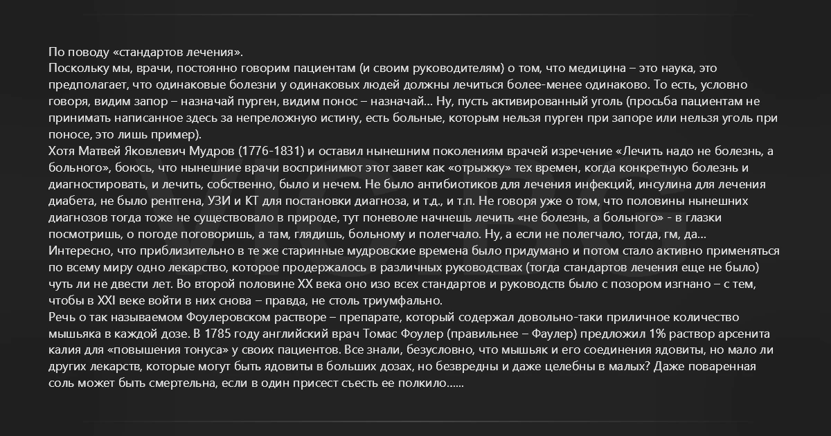 По поводу «стандартов лечения». Поскольку мы, врачи, постоянно говорим пациентам (и своим руководителям) о том, что медицина – это наука, это предполагает, что одинаковые болезни у одинаковых людей должны лечиться более-менее одинаково. То есть, условно говоря, видим запор – назначай пурген, видим понос – назначай… Ну, пусть активированный уголь (просьба пациентам не принимать написанное здесь за непреложную истину, есть больные, которым нельзя пурген при запоре или нельзя уголь при поносе, это лишь пример). Хотя Матвей Яковлевич Мудров (1776-1831) и оставил нынешним поколениям врачей изречение «Лечить надо не болезнь, а больного», боюсь, что нынешние врачи воспринимют этот завет как «отрыжку» тех времен, когда конкретную болезнь и диагностировать, и лечить, собственно, было и нечем. Не было антибиотиков для лечения инфекций, инсулина для лечения диабета, не было рентгена, УЗИ и КТ для постановки диагноза, и т.д., и т.п. Не говоря уже о том, что половины нынешних диагнозов тогда тоже не существовало в природе, тут поневоле начнешь лечить «не болезнь, а больного» - в глазки посмотришь, о погоде поговоришь, а там, глядишь, больному и полегчало. Ну, а если не полегчало, тогда, гм, да… Интересно, что приблизительно в те же старинные мудровские времена было придумано и потом стало активно применяться по всему миру одно лекарство, которое продержалось в различных руководствах (тогда стандартов лечения еще не было) чуть ли не двести лет. Во второй половине XX века оно изо всех стандартов и руководств было с позором изгнано – с тем, чтобы в XXI веке войти в них снова – правда, не столь триумфально. Речь о так называемом Фоулеровском растворе – препарате, который содержал довольно-таки приличное количество мышьяка в каждой дозе. В 1785 году английский врач Томас Фоулер (правильнее – Фаулер) предложил 1% раствор арсенита калия для «повышения тонуса» у своих пациентов. Все знали, безусловно, что мышьяк и его соединения ядовиты, но мало ли других лекарств, которые могут быть ядовиты в больших дозах, но безвредны и даже целебны в малых? Даже поваренная соль может быть смертельна, если в один присест съесть ее полкило… И вот врачи Англии, а потом и всего мира начали поить своих пациентов слабым (сравнительно) раствором мышьяка, грубо говоря, в день по чайной ложке, в течение многих лет… При помощи данного чудодейственного средства лечили и упадок сил, и малокровие, и экзему, и псориаз… Говорят, особенно хорошо излечивалось этим препаратом малокровие – у бледных как смерть девиц после месяца-другого приема данного снадобья на лицах появлялся румянец… Такой эффект на других препаратах был просто недостижим, продажи Фоулеровского раствора росли в геометрической прогрессии по всему миру. Будь это в наше время, Фоулеровский раствор обязательно попал бы во все мыслимые стандарты лечения анемии, я не сомневаюсь. Прошло, вы не поверите, 100 лет от момента изобретения до «начала падения» Фоулеровского раствора. В 1885 году известный британский медик Гетчинсон (a.k.a. Hutchinson, Хатчинсон), осматривая одного из больных псориазом, который в течение многих лет лечился, втирая в кожу Фоулеровский раствор, и у которого именно на этих местах впоследствии развился рак кожи, впервые предположил, что раствор мышьяка может являться канцерогеном. Довольно быстро эта гипотеза Гетчинсо