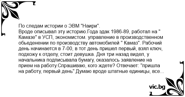 По следам истории о ЭВМ "Наири". Вроде описывал эту историю.Года эдак 1986-89, работал на " Камазе" в УСП, экономистом. управление в производственном обьеденении по производству автомобилей " Камаз". Рабочий день начинается в 7-00, в тот день пришел первый, взял ключ, подхожу к отделу, стоит девушка. Дня три назад видел, у начальника подписывала бумагу, оказалось заявление на прием на работу.Спрашиваю, кого ждете? Отвечает: "пришла на работу, первый день" Думаю вроде штатные единицы, все заняты и мужчин желательно, все-таки оперативный отдел.Девушка отвечает " Я к Вам оператором ЭВМ" Я уже открыл кабинет, и мы зашли. А в отделах стояли тогда " роботтроны" это такие аппараты ( эвм) работали с перфокартами. Для меня программист это " божество", смотрю другими глазами и спрашиваю : " а где Вы учились, и по какой специальности?" Ответ серьезный:в СПТУ( сельхозучилище), оператор машинного доения" Хорошо, уже в кабинете, а не в коридоре, было куда присесть.