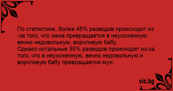 По статистике, более 45% разводов происходит из-за того, что жена превращается в неухоженную, вечно недовольную, ворчливую бабу.