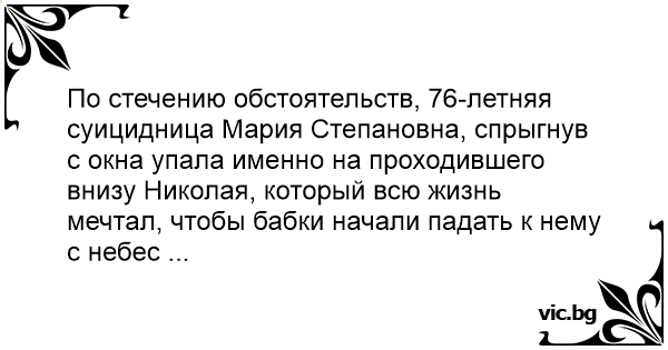 По стечению обстоятельств, 76-летняя суицидница Мария Степановна, спрыгнув с окна упала именно на проходившего внизу Николая, который всю жизнь мечтал, чтобы бабки начали падать к нему с небес ...