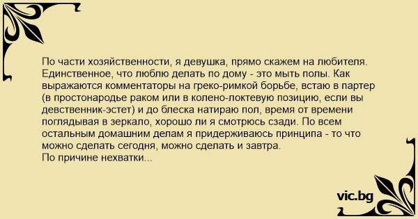 Единственное, что люблю делать по дому - это мыть полы. Как выражаются комментаторы на греко-римкой борьбе, встаю в партер (в простонародье раком или в колено-локтевую позицию, если вы девственник-эстет) и до блеска натираю пол, время от времени поглядывая в зеркало, хорошо ли я смотрюсь сзади. По всем остальным домашним делам я придерживаюсь принципа - то что можно сделать сегодня, можно сделать и завтра.