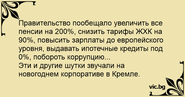 Правительство пообещало увеличить все пенсии на 200%, снизить тарифы ЖХК на 90%, повысить зарплаты до европейского уровня, выдавать ипотечные кредиты под 0%, побороть коррупцию...