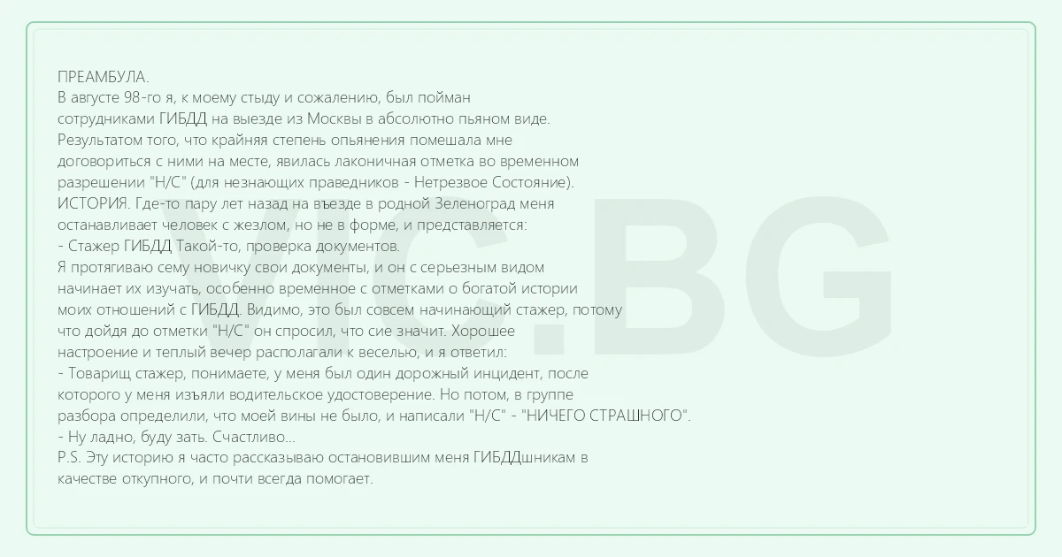 ПРЕАМБУЛА. В августе 98-го я, к моему стыду и сожалению, был пойман сотрудниками ГИБДД на выезде из Москвы в абсолютно пьяном виде. Результатом того, что крайняя степень опьянения помешала мне договориться с ними на месте, явилась лаконичная отметка во временном разрешении "Н/С" (для незнающих праведников - Нетрезвое Состояние). ИСТОРИЯ. Где-то пару лет назад на въезде в родной Зеленоград меня останавливает человек с жезлом, но не в форме, и представляется: - Стажер ГИБДД Такой-то, проверка документов. Я протягиваю сему новичку свои документы, и он с серьезным видом начинает их изучать, особенно временное с отметками о богатой истории моих отношений с ГИБДД. Видимо, это был совсем начинающий стажер, потому что дойдя до отметки "Н/С" он спросил, что сие значит. Хорошее настроение и теплый вечер располагали к веселью, и я ответил: - Товарищ стажер, понимаете, у меня был один дорожный инцидент, после которого у меня изъяли водительское удостоверение. Но потом, в группе разбора определили, что моей вины не было, и написали "Н/С" - "НИЧЕГО СТРАШНОГО". - Ну ладно, буду зать. Счастливо... P.S. Эту историю я часто рассказываю остановившим меня ГИБДДшникам в качестве откупного, и почти всегда помогает.