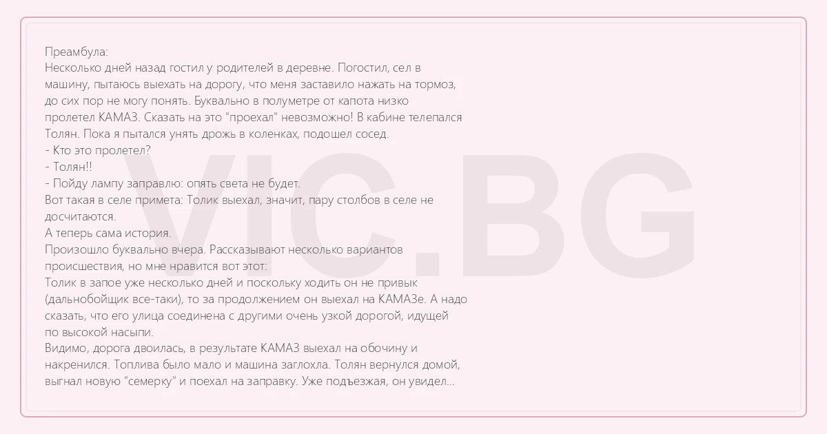 накренился. Топлива было мало и машина заглохла. Толян вернулся домой,