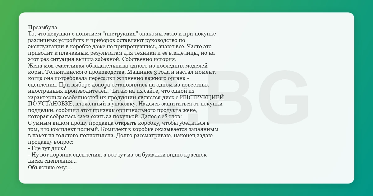 Преамбула. То, что девушки с понятием "инструкция" знакомы мало и при покупке различных устройств и приборов оставляют руководство по эксплуатации в коробке даже не притронувшись, знают все. Часто это приводит к плачевным результатам для техники и её владелицы, но на этот раз ситуация вышла забавной. Собственно история. Жена моя счастливая обладательница одного из последних моделей корыт Тольяттинского производства. Машинке 3 года и настал момент, когда она потребовала пересадки жизненно важного органа - сцепления. При выборе донора остановились на одном из известных иностранных производителей. Читаю на их сайте, что одной из характерных особенностей их продукции является диск с ИНСТРУКЦИЕЙ ПО УСТАНОВКЕ, вложенный в упаковку. Надеясь защититься от покупки подделки, сообщил этот признак оригинального продукта жене, которая собралась сама ехать за покупкой. Далее с её слов: С умным видом прошу продавца открыть коробку, чтобы убедиться в том, что комплект полный. Комплект в коробке оказывается запаянным в пакет из толстого полиэтилена. Долго рассматриваю, наконец задаю продавцу вопрос: - Где тут диск? - Ну вот корзина сцепления, а вот тут из-за бумажки видно краешек диска сцепления... Объясняю ему: - Да нееет! Не эээтот! И тут понимаю, что не могу подобрать правильное слово! Туплю несколько секунд и выстреливаю: - Установочный! и зачем-то добавляю: - ... с драйверами... FAIL!!! Сама вся пунцовая от стыда, решаю "доиграть роль блондинки" и быстро говорю продавцу, у которого челюсть уже практически коснулась пола: - Ладно, если что - скачаем... Беру!