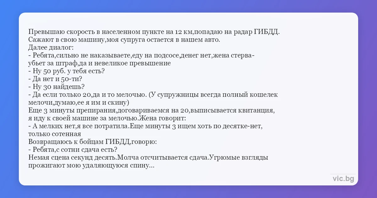 Превышаю скорость в населенном пункте на 12 км,попадаю на радар ГИБДД. Сажают в свою машину,моя супруга остается в нашем авто. Далее диалог: - Ребята,сильно не наказываете,еду на подсосе,денег нет,жена стерва- убьет за штраф,да и невеликое превышение - Ну 50 руб. у тебя есть? - Да нет и 50-ти? - Ну 30 найдешь? - Да если только 20,да и то мелочью. (У супружницы всегда полный кошелек мелочи,думаю,ее я им и скину) Еще 3 минуты препирания,договариваемся на 20,выписывается квитанция, я иду к своей машине за мелочью.Жена говорит: - А мелких нет,я все потратила.Еще минуты 3 ищем хоть по десятке-нет, только сотенная Возвращаюсь к бойцам ГИБДД,говорю: - Ребята,с сотни сдача есть? Немая сцена секунд десять.Молча отсчитывается сдача.Угрюмые взгляды прожигают мою удаляющуюся спину...
