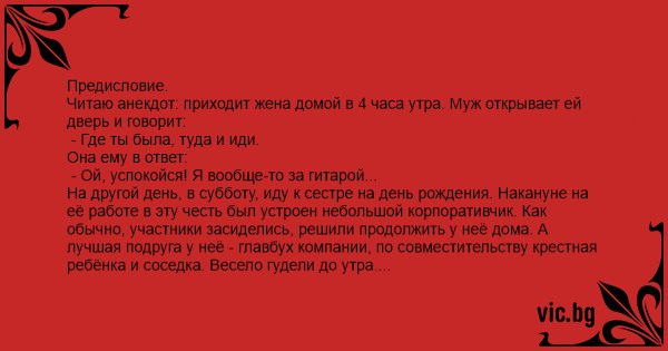 Читаю анекдот: приходит жена домой в 4 часа утра. Муж открывает ей дверь и говорит: