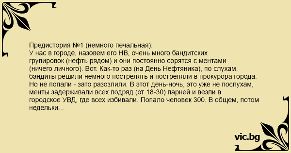 Предистория №1 (немного печальная): У нас в городе, назовем его НВ, очень много бандитских групировок (нефть рядом) и они постоянно сорятся с ментами (ничего личного). Вот. Как-то раз (на День Нефтяника), по слухам, бандиты решили немного пострелять и постреляли в прокурора города. Но не попали - зато разозлили. В этот день-ночь, это уже не послухам, менты задерживали всех подряд (от 18-30) парней и везли в городское УВД, где всех избивали. Попало человек 300. В общем, потом недельки две в городе на улицах после 18:00 пустенько было - боялись выйти. Предистория №2: У меня в течении полутора лет есть машина: Opel Record. Вот. Машина есть - прав нет и не было. САМА ИСТОРИЯ: Решил я начать учиться ездить на машине по городу (ездить умел, но по городу еще ни разу не ездил). Почему-то решение пришло в голову дня через 4 после вышеописанных событий. Едем мы (Я - за рулем, Арт, Темный - прозвище такое и баба Темного) к еще одному другу на рюмку чая, впереди потихоньку едет Таврия. И едет так непонятно - ни два, ни полтора. Ну решил я ее обогнать, только сравнялся с ней - Таврия тоже вдруг решила ехать быстрее. У меня встречная уже близко, в глазах ужас. Короче подрезал я ее красиво (Таврия чуть в кювет не улетела), сзади ехавший друг (я его не видел, он потом расказывал) сказал учебное пособие можно составлять. Вот. Ну подрезал и уехал себе дальше, все-таки чай ждет. Попили чаю - минут сорок. Надо ехать обратно. За рулем Арт (я после чая за руль не сажусь). Едем себе, вдруг сзади бобик, мигалки, крики в матюкальник остановиться. А надо сказать, что про подрез все уже давно забыли. Останавливаемся. Вываливается бригада ОМОНовцев и пошло-поехало: Руки накапот, ноги шире (почему они всегда хотят чтоб человек сел на шпагат?) и т.д. Мы тихонько так спрашиваем: "А в чем собственно дело?". Отвечают: "Сами не знаем но вас уже весь город минут тридцать ловит - как вы до сих пор катаетесь - не понимаем." Ну ладно, Темного с девчoнкой отпустили а меня (машина-то моя) и Арт везут в УВД. Дальше расскажу в двух частях: что было с нами и что делал Темный. Нас привезли в УВД, вышел какой-то капитан, говорит: "Че делаете?! Чуть не угробили эксперта-криминалиста (он оказывается в Таврии ехал)! Могли сорвать работу! Кто был за рулем?" Я отвечаю: "Я (прав нету - забирать нечего). Короче вызвали ГАИшника, мы с ним договорились, за 50т.р. мы уехали. Как только приехали домой кидаю на пейдж Темному, что у нас все ОК и мы дома. А теперь самое интересное, что делал в это время Темный (я просто горд, что у меня есть такие друзья). Темный (весом 110кг, кругленький такой) помня недавние события (см.выше), думает: "Ну все, встряли мужики, нужно что-то делать. Все знакомые из ментовки где-то в отъезде, отмазывать некому". И что-бы вы думали он делает? Замедте нас в ментовки держали минут 15, так что все дальше происходило стремительно быстро. Темный ловит тачку, едет домой, одевается во все черное (шапка вязанка, куртка кожанка, перчатки - все как положено), едет к родственникам, забирает у них свою камеру (!) и рулит к УВД. А забыл сказать у УВД стоит высокая радиовышка, с нее видно площадь внутри УВД (где парней пи%:?ли) и когда после лютовства ментов обсуждали проишедшее обговаривался вариант снять на камеру-бы все это и потом в суд подать. Догадываетесь, что делал Темный? Правильно, ползком подобрался к вышке залез на нее и ждет когда нас (меня и Арта выведут изби