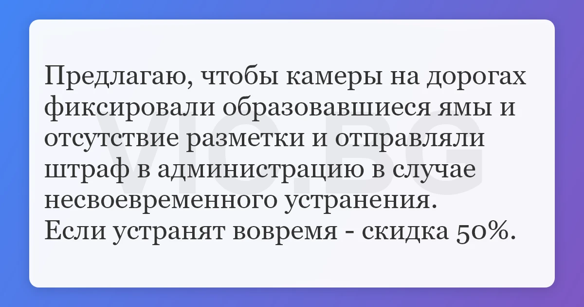 Предлагаю, чтобы камеры на дорогах фиксировали образовавшиеся ямы и отсутствие разметки и отправляли штраф в администрацию в случае несвоевременного устранения.