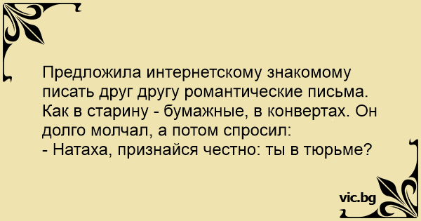 Предложила интернетскому знакомому писать друг другу романтические письма. Как в старину - бумажные, в конвертах. Он долго молчал, а потом спросил:
