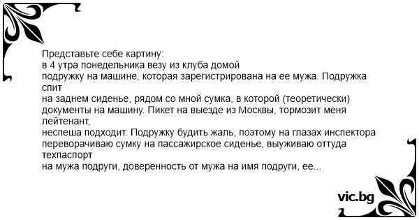 Представьте себе картину: в 4 утра понедельника везу из клуба домой подружку на машине, которая зарегистрирована на ее мужа. Подружка спит на заднем сиденье, рядом со мной сумка, в которой (теоретически) документы на машину. Пикет на выезде из Москвы, тормозит меня лейтенант, неспеша подходит. Подружку будить жаль, поэтому на глазах инспектора переворачиваю сумку на пассажирское сиденье, выуживаю оттуда техпаспорт на мужа подруги, доверенность от мужа на имя подруги, ее права. Добавляю к этой макулатуре свои права и талон, и вылезаю к удивленному гаишнику. - Ваша машина? - Нет. - Ее? - кивок в сторону заднего сиденья. - Нет! - Чья??? - Ее мужа... Обходит машину: "Откройте багажник!" открываю... Откидывает полочку (машина - девятка) и ошарашивает вопросом: - ГДЕ МУЖ???