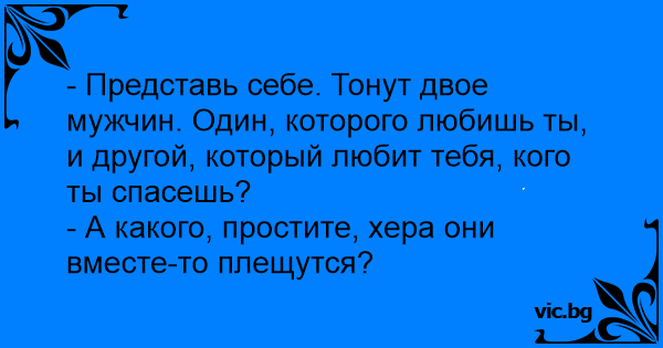- Представете си госпожо, давят се двама мъже. Единият го обичате Вие, другият обича Вас. Кого ще спасите?