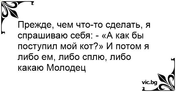 Прежде, чем что-то сделать, я спрашиваю себя: - «А как бы поступил мой кот?» И потом я либо ем, либо сплю, либо какаю Молодец