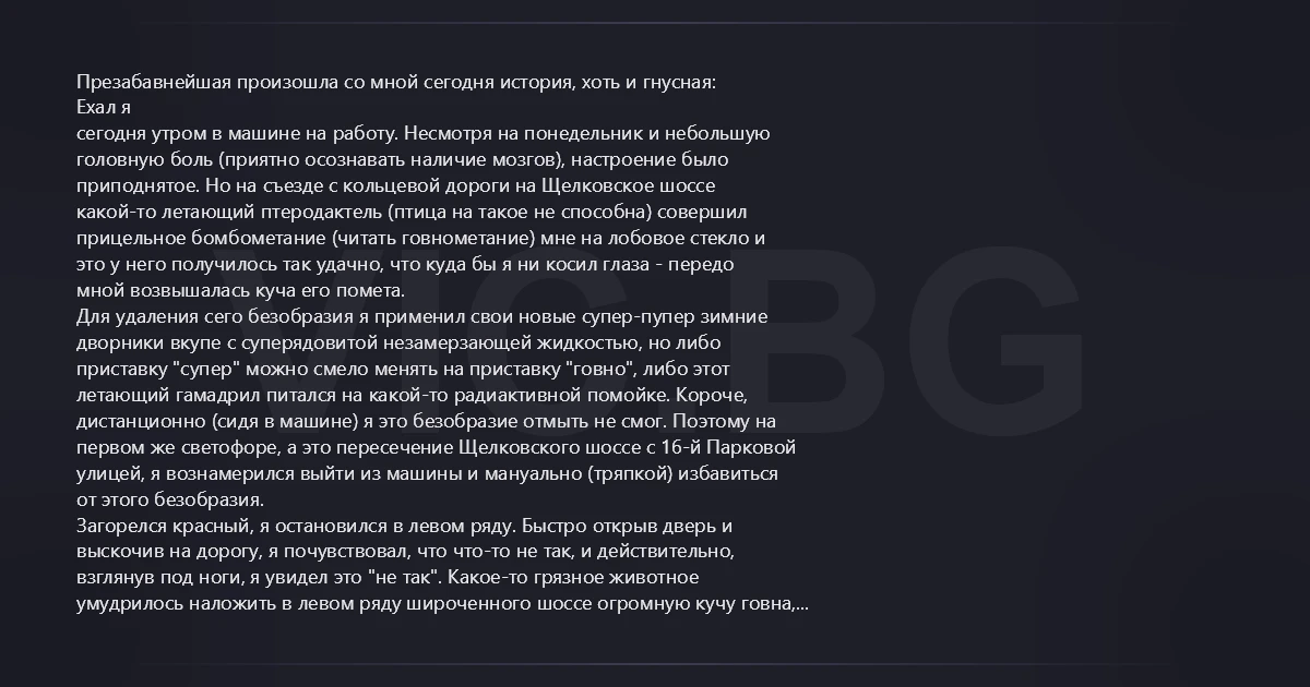Презабавнейшая произошла со мной сегодня история, хоть и гнусная: Ехал я сегодня утром в машине на работу. Несмотря на понедельник и небольшую головную боль (приятно осознавать наличие мозгов), настроение было приподнятое. Но на съезде с кольцевой дороги на Щелковское шоссе какой-то летающий птеродактель (птица на такое не способна) совершил прицельное бомбометание (читать говнометание) мне на лобовое стекло и это у него получилось так удачно, что куда бы я ни косил глаза - передо мной возвышалась куча его помета. Для удаления сего безобразия я применил свои новые супер-пупер зимние дворники вкупе с суперядовитой незамерзающей жидкостью, но либо приставку "супер" можно смело менять на приставку "говно", либо этот летающий гамадрил питался на какой-то радиактивной помойке. Короче, дистанционно (сидя в машине) я это безобразие отмыть не смог. Поэтому на первом же светофоре, а это пересечение Щелковского шоссе с 16-й Парковой улицей, я вознамерился выйти из машины и мануально (тряпкой) избавиться от этого безобразия. Загорелся красный, я остановился в левом ряду. Быстро открыв дверь и выскочив на дорогу, я почувствовал, что что-то не так, и действительно, взглянув под ноги, я увидел это "не так". Какое-то грязное животное умудрилось наложить в левом ряду широченного шоссе огромную кучу говна, в которую я с лету и вступил. Проклиная всех четвероногих на этом свете, я увидел рядом с этим шедевром кишечной мысли кусок туалетной бумаги и понял, что зря обиделся на братьев наших меньших. ЭТО сделала извращенная человеческая особь, к тому же обладающая навыком маскировки, потому что в 50 метрах от светофора расположен стационарный пост ГАИ. Как вывод из этого неприятного инциндента - пропажа настроения и усилившаяся головная боль по поводу где отмыть ботинки. Все честно. PS Хотя может это милиционеры так развлекаются)))