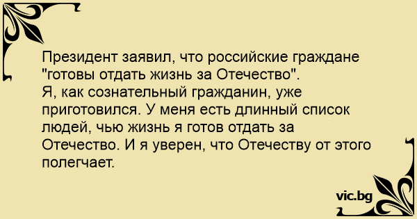 Я, как сознательный гражданин, уже приготовился. У меня есть длинный список людей, чью жизнь я готов отдать за Отечество. И я уверен, что Отечеству от этого полегчает.