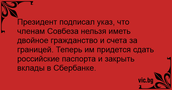 Президент подписал указ, что членам Совбеза нельзя иметь двойное гражданство и счета за границей. Теперь им придется сдать российские паспорта и закрыть вклады в Сбербанке.