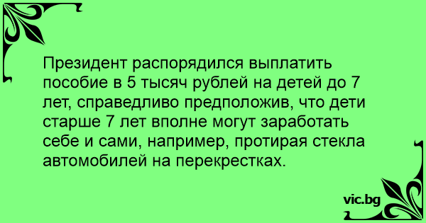 Президент распорядился выплатить пособие в 5 тысяч рублей на детей до 7 лет, справедливо предположив, что дети старше 7 лет вполне могут заработать себе и сами, например, протирая стекла автомобилей на перекрестках.