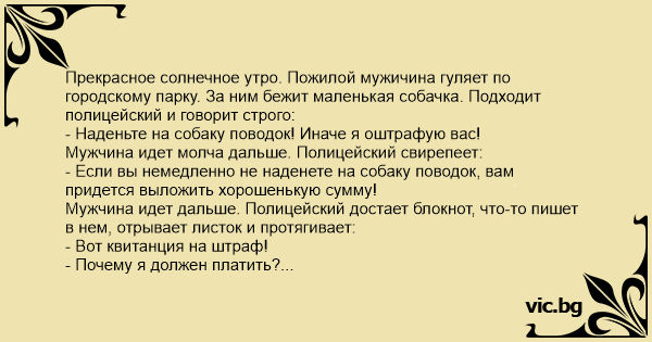 Прекрасное солнечное утро. Пожилой мужичина гуляет по городскому парку. За ним бежит маленькая собачка. Подходит полицейский и говорит строго: