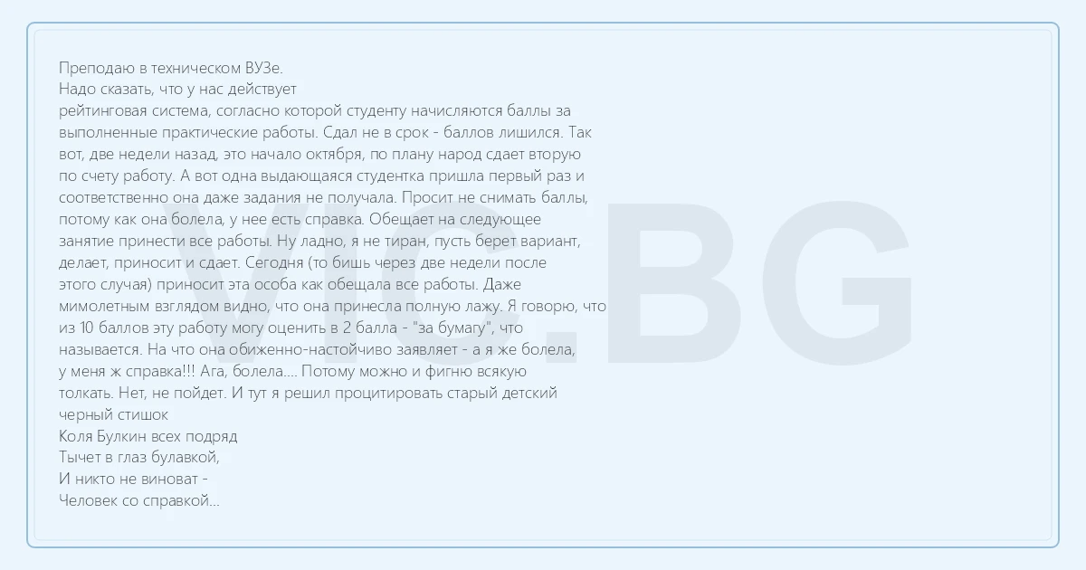 Преподаю в техническом ВУЗе. Надо сказать, что у нас действует рейтинговая система, согласно которой студенту начисляются баллы за выполненные практические работы. Сдал не в срок - баллов лишился. Так вот, две недели назад, это начало октября, по плану народ сдает вторую по счету работу. А вот одна выдающаяся студентка пришла первый раз и соответственно она даже задания не получала. Просит не снимать баллы, потому как она болела, у нее есть справка. Обещает на следующее занятие принести все работы. Ну ладно, я не тиран, пусть берет вариант, делает, приносит и сдает. Сегодня (то бишь через две недели после этого случая) приносит эта особа как обещала все работы. Даже мимолетным взглядом видно, что она принесла полную лажу. Я говорю, что из 10 баллов эту работу могу оценить в 2 балла - "за бумагу", что называется. На что она обиженно-настойчиво заявляет - а я же болела, у меня ж справка!!! Ага, болела.... Потому можно и фигню всякую толкать. Нет, не пойдет. И тут я решил процитировать старый детский черный стишок Коля Булкин всех подряд Тычет в глаз булавкой, И никто не виноват - Человек со справкой Народ после полусекундного обдумывания произведения просто лег. Только за реакцией этой особы я не пронаблюдал, к сожалению.