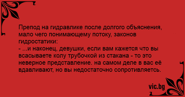 Препод на гидравлике после долгого объяснения, мало чего понимающему потоку, законов гидростатики: