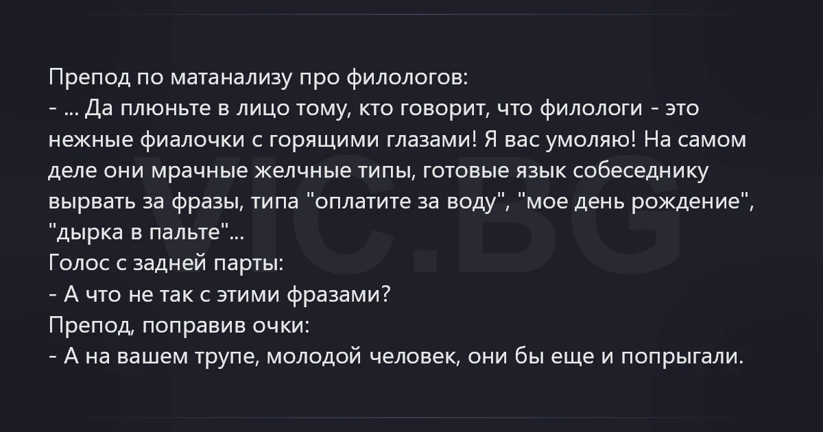 Препод по матанализу про филологов: - ... Да плюньте в лицо тому, кто говорит, что филологи - это нежные фиалочки с горящими глазами! Я вас умоляю! На самом деле они мрачные желчные типы, готовые язык собеседнику вырвать за фразы, типа "оплатите за воду", "мое день рождение", "дырка в пальте"... Голос с задней парты: - А что не так с этими фразами? Препод, поправив очки: - А на вашем трупе, молодой человек, они бы еще и попрыгали.
