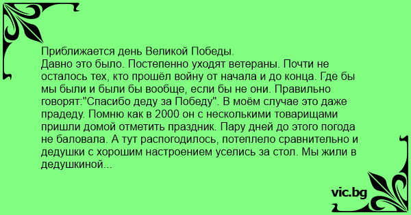 Давно это было. Постепенно уходят ветераны. Почти не осталось тех, кто прошёл войну от начала и до конца. Где бы мы были и были бы вообще, если бы не они. Правильно говорят:"Спасибо деду за Победу". В моём случае это даже прадеду. Помню как в 2000 он с несколькими товарищами пришли домой отметить праздник. Пару дней до этого погода не баловала. А тут распогодилось, потеплело сравнительно и дедушки с хорошим настроением уселись за стол. Мы жили в дедушкиной квартире и мама бегала между кухней и залом, выставляя на стол всё, что целое утро готовила. Отец открыл беленькую и беседа пошла. Каждый что-то вспоминал. А мне более всего запомнился рассказ сухонького старичка Николая. Его призвали в начале 44 с Киевской области. И сразу на фронт. Отделался какими-то мелкими ранениями и встретил Победу в Чехословакии. Говорил, что радовались все,как дети малые. Как строили планы мирной жизни. Как его товарищ обещал к нему приехать и на сестре жениться.