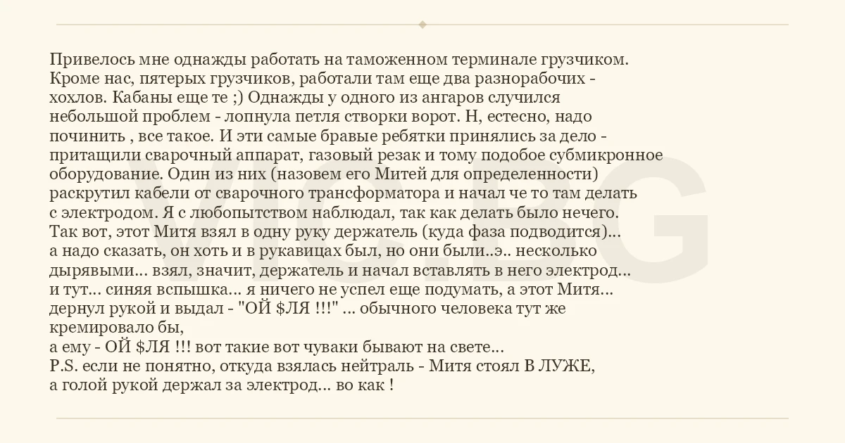 Привелось мне однажды работать на таможенном терминале грузчиком. Кроме нас, пятерых грузчиков, работали там еще два разнорабочих - хохлов. Кабаны еще те ;) Однажды у одного из ангаров случился небольшой проблем - лопнула петля створки ворот. Н, естесно, надо починить , все такое. И эти самые бравые ребятки принялись за дело - притащили сварочный аппарат, газовый резак и тому подобое субмикронное оборудование. Один из них (назовем его Митей для определенности) раскрутил кабели от сварочного трансформатора и начал че то там делать с электродом. Я с любопытством наблюдал, так как делать было нечего. Так вот, этот Митя взял в одну руку держатель (куда фаза подводится)... а надо сказать, он хоть и в рукавицах был, но они были..э.. несколько дырявыми... взял, значит, держатель и начал вставлять в него электрод... и тут... синяя вспышка... я ничего не успел еще подумать, а этот Митя... дернул рукой и выдал - "ОЙ $ЛЯ !!!" ... обычного человека тут же кремировало бы, а ему - ОЙ $ЛЯ !!! вот такие вот чуваки бывают на свете... P.S. если не понятно, откуда взялась нейтраль - Митя стоял В ЛУЖЕ, а голой рукой держал за электрод... во как !