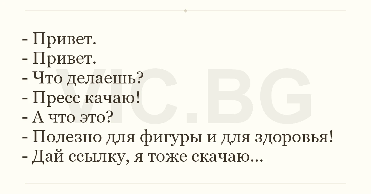 - Привет. - Привет. - Что делаешь? - Пресс качаю! - А что это? - Полезно для фигуры и для здоровья! - Дай ссылку, я тоже скачаю...