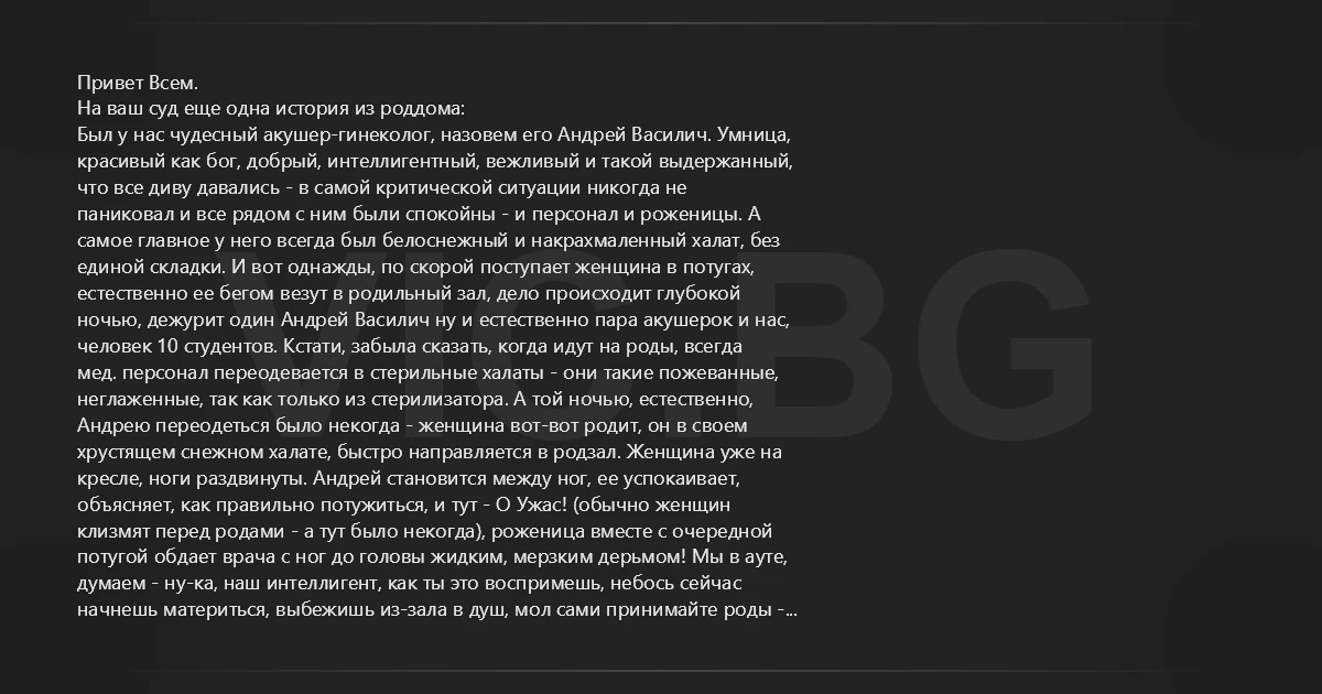 единой складки. И вот однажды, по скорой поступает женщина в потугах,