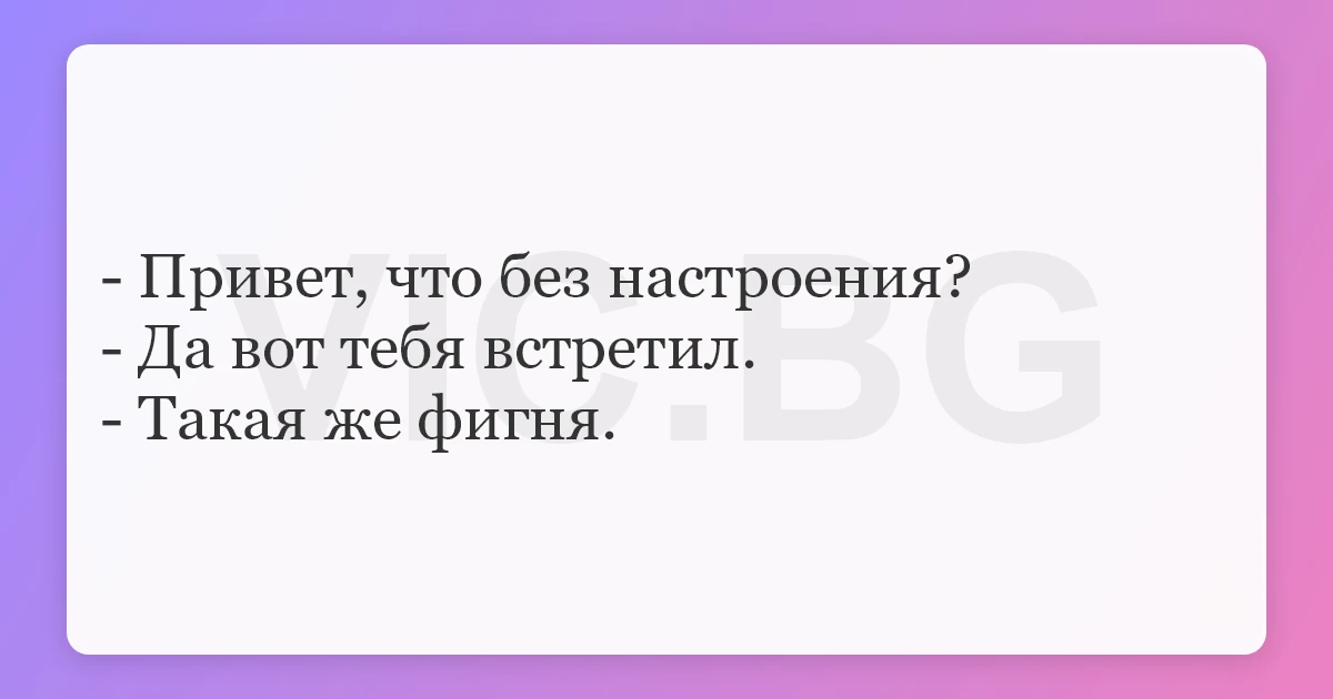 - Привет, что без настроения? - Да вот тебя встретил. - Такая же фигня.