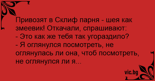 Привозят в Склиф парня - шея как змеевик! Откачали, спрашивают:
