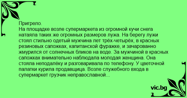 На площадке возле супермаркета из огромной kучи снега натаяла таких же огромных размеров лужа. На берегу лужи стоял стильно одетый мужчина лет трёх-четырёх, в красных резиновых сапожках, капитанской фуражке, и зачарованно жмурился от солнечных бликов на воде. За мужчиной в красных сапожках внимательно наблюдала молодая женщина. Она стояла неподалёку и разговаривала по телефону. У цветочной палатки курила продавщица. Возле служебного входа в супермаркет грузчик неправославной наружности занимался пустой тарой. За цветочной палаткой приткнулся экипаж ГАИ, высматривая нарушителей. Так же на месте присутствовали: старушка с собачкой на поводке, две школьницы, мамаша с коляской, и гражданин неопределённого рода занятий в кепке и с пакетом. Больше ничего примечательного в пределах видимости не наблюдалось.