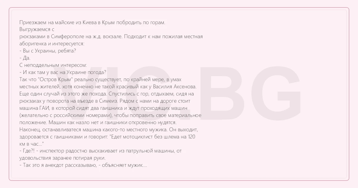 Приезжаем на майские из Киева в Крым побродить по горам. Выгружаемся с рюкзаками в Симферополе на ж.д. вокзале. Подходит к нам пожилая местная аборигенка и интересуется: - Вы с Украины, ребята? - Да. С неподдельным интересом: - И как там у вас на Украине погода? Так что "Остров Крым" реально существует, по крайней мере, в умах местных жителей, хотя конечно не такой красивый как у Василия Аксенова. Еще один случай из этого же похода. Спустились с гор, отдыхаем, сидя на рюкзаках у поворота на въезде в Симеиз. Рядом с нами на дороге стоит машина ГАИ, в которой сидят два гаишника и ждут проходящих машин (желательно с российскими номерами), чтобы поправить свое материальное положение. Машин как назло нет и гаишники откровенно нудятся. Наконец, останавливатеся машина какого-то местного мужика. Он выходит, здоровается с гаишниками и говорит: "Едет мотоциклист без шлема на 120 км в час..." - Где?! - инспектор радостно выскакивает из патрульной машины, от удовольствия заранее потирая руки. - Так это я анекдот рассказываю, - объясняет мужик. - Твою мать, - разочарованно ругается гаишник, с ненавистью смотрит на рассказчика анекдота и опять лезет в патрульную машину.