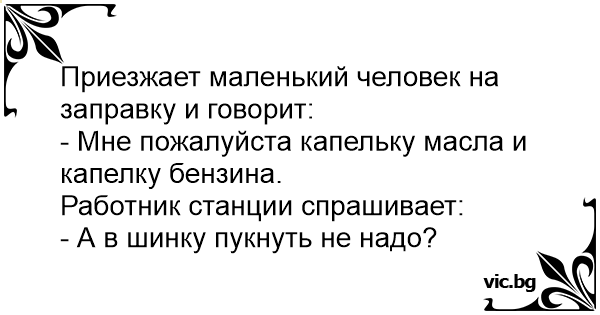 Тетовчанец на бензинска Едно джудже отива на бензиностанцията със своята миниатюрна количка и казва на бензинаджията: Едно много малко джудженце отишло на една бензиностанция. То карало една много, ама много малка количка. Спряло я до колонката, размахало с двете ръце и се развикало, колкото му глас държи: Przyjeżdża na stację benzynową krasnoludek swoim malutkim samochodzikiem i mówi: - Poproszę dwie kropelki benzyny. A na to sprzedawca: - I co, może jeszcze pierdnąć w oponki?