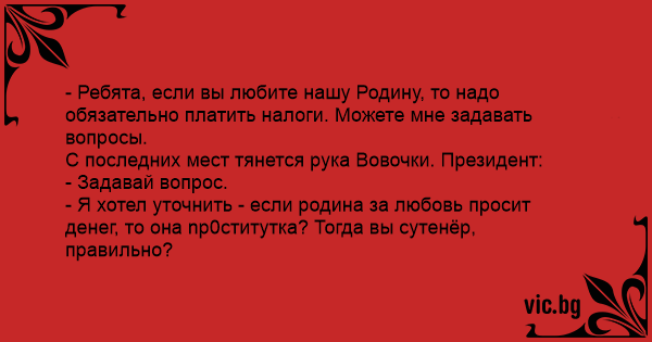 - Я хотел уточнить - если родина за любовь просит денег, то она np0cтитyтка? Тогда вы сутенёр, правильно?