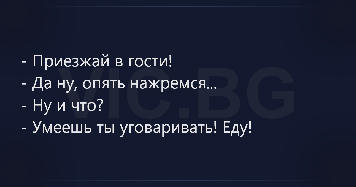 - Приезжай в гости! - Да ну, опять нажремся... - Ну и что? - Умеешь ты уговаривать! Еду!