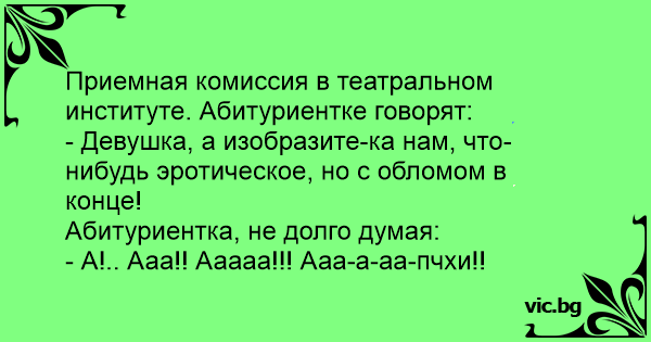 Приемная комиссия в театральном институте. Абитуриентке говорят:<br />- Девушка, а изобразите-ка нам, что-нибудь эротическое, но с обломом в конце! <br />Абитуриентка, не долго думая: <br />- А!.. Ааа!! Ааааа!!! Ааа-а-аа-пчхи!!