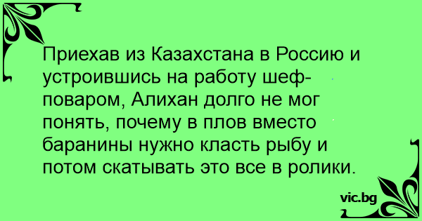 Приехав из Казахстана в Россию и устроившись на работу шеф-поваром, Алихан долго не мог понять, почему в плов вместо баранины нужно класть рыбу и потом скатывать это все в ролики.