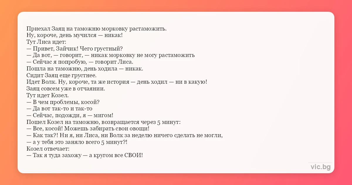 Приехал Заяц на таможню морковку растаможить. Ну, короче, день мучился — никак! Тут Лиса идет: — Привет, Зайчик! Чего грустный? — Да вот, — говорит, — никак морковку не могу растаможить — Сейчас я попробую, — говорит Лиса. Пошла на таможню, день ходила — никак. Сидит Заяц еще грустнее. Идет Волк. Ну, короче, та же история — день ходил — ни в какую! Заяц совсем уже в отчаянии. Тут идет Козел. — В чем проблемы, косой? — Да вот так-то и так-то — Сейчас, подожди, я — мигом! Пошел Козел на таможню, возвращается через 5 минут: — Все, косой! Можешь забирать свои овощи! — Как так?! Ни я, ни Лиса, ни Волк за неделю ничего сделать не могли, — а у тебя это заняло всего 5 минут?! Козел отвечает: — Так я туда захожу — а кругом все СВОИ!