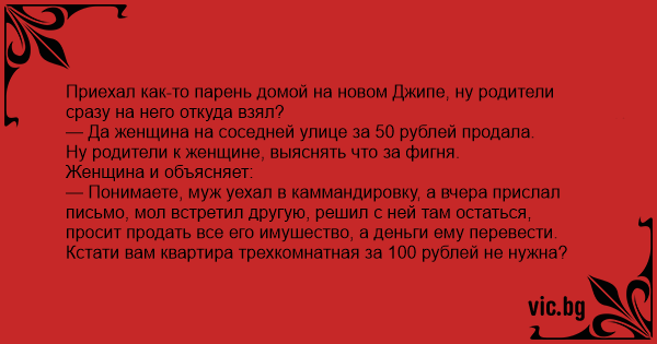 — Понимаете, муж уехал в каммандировку, а вчера прислал письмо, мол встретил другую, решил с ней там остаться, просит продать все его имушество, а деньги ему перевести. Кстати вам квартира трехкомнатная за 100 рублей не нужна?